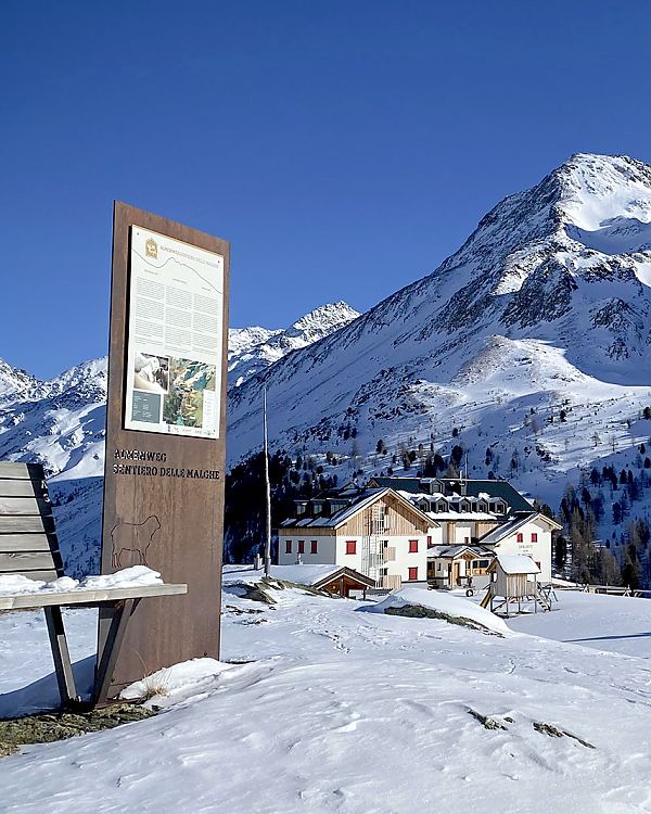 Der Winter hüllt die Berge mit Schnee, aber der Vinschgauer Sonnenberg bleibt meist schneefrei, schöne Wanderungen entlang den Waalwegen sind auch im Winter möglich.